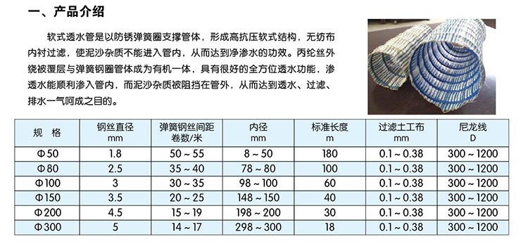 透水管是以防銹彈簧圈支撐管體,形成高抗壓軟式結(jié)構(gòu),無(wú)紡布內(nèi)襯過(guò)濾,使泥砂雜質(zhì)不能進(jìn)入管內(nèi),從而達(dá)到凈滲水的功能。滌綸絲外繞祉覆層具有優(yōu)良吸水性,能迅速收集土體中多余水份。橡膠筋使管壁被覆層與彈簧鋼圈管體成為有機(jī)一體,具有很好的透水功能,滲透水順利滲入管內(nèi),而泥砂雜質(zhì)被阻擋在管外,從而達(dá)到透水、過(guò)濾、排水一氣呵成之目的。