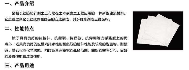 長絲土工布為聚酯長絲針刺無紡土工布,不含化學添加劑,也不經熱處理,是環保型的建筑材料。
